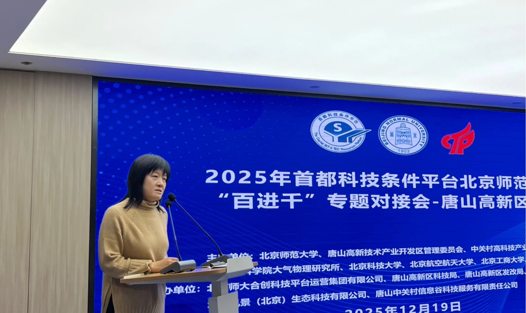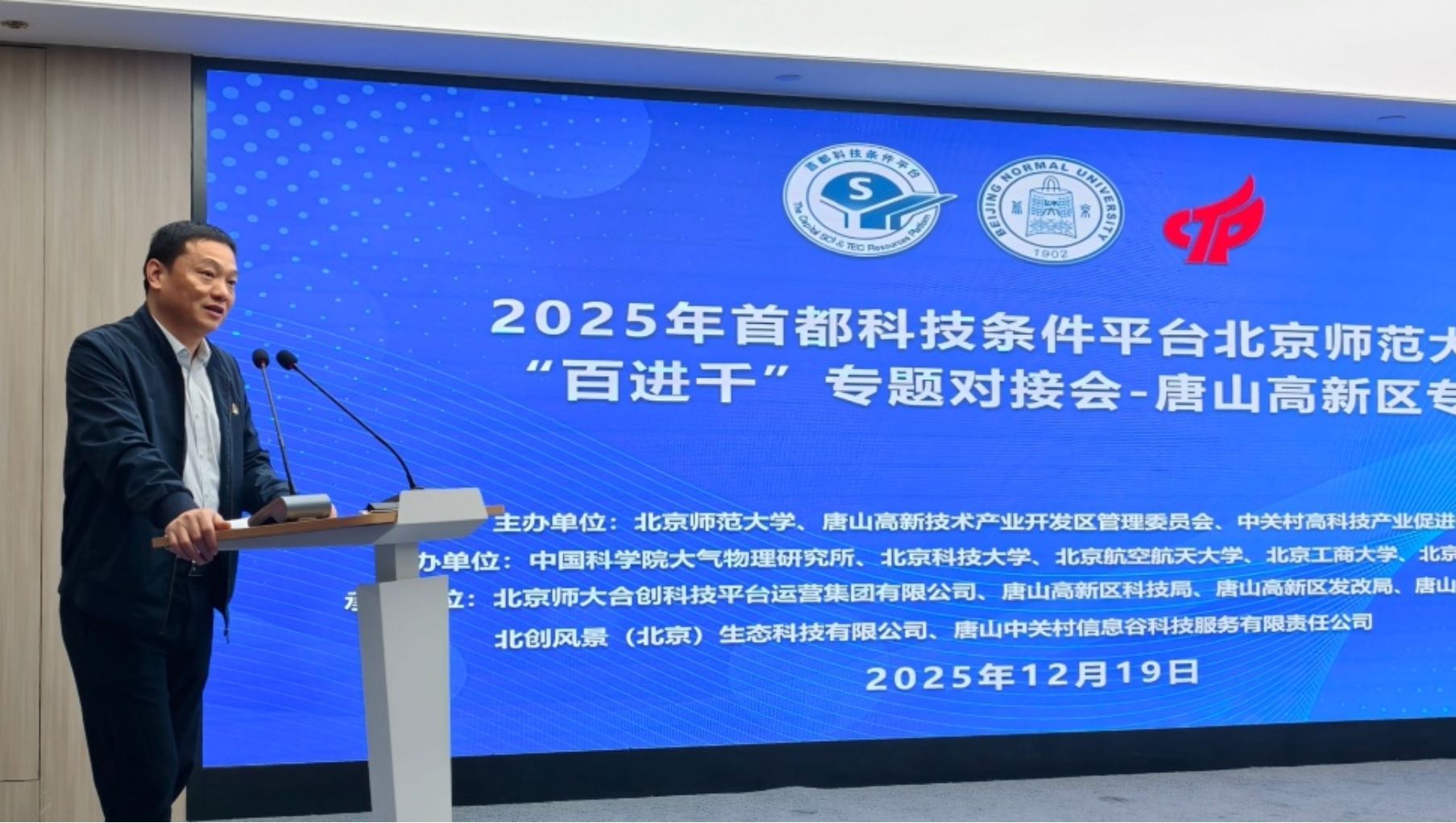 2025年12月19日,“2025年首都科技条件平台北京师范大学‘百进千’专题对接会—唐山高新区专场”在唐山高新技术产业开发区成功举办。会议由北京师范大学(首都科技条件平台开放单位)联合唐山高新技术产业开发区管理委员会和中关村高科技产业促进中心共同主办。来自唐山高新技术产业开发区政府、北京市科委中关村管委会、北京师范大学、北京师大科技集团、中国科学院大气物理研究所、北京科技大学、北京航空航天大学、北京工商大学、北京量子信息科学研究院以及唐山地区53家企业的代表60余人参加了会议。北京师范大学实验室安全与设备管理处处长和分析测试中心主任左锐、北京市科委、中关村管委会高促中心部门负责人毛振芹、唐山高新区管委会副主任安海涛、唐山高新技术创业中心主任曹雅静、中国科学院大气物理研究所公共技术中心主任辛金元、北京工商大学实验室管理处处长康智勇等出席了会议。会议由北京师范大学首都科技条件平台工作负责人常崇艳主持。